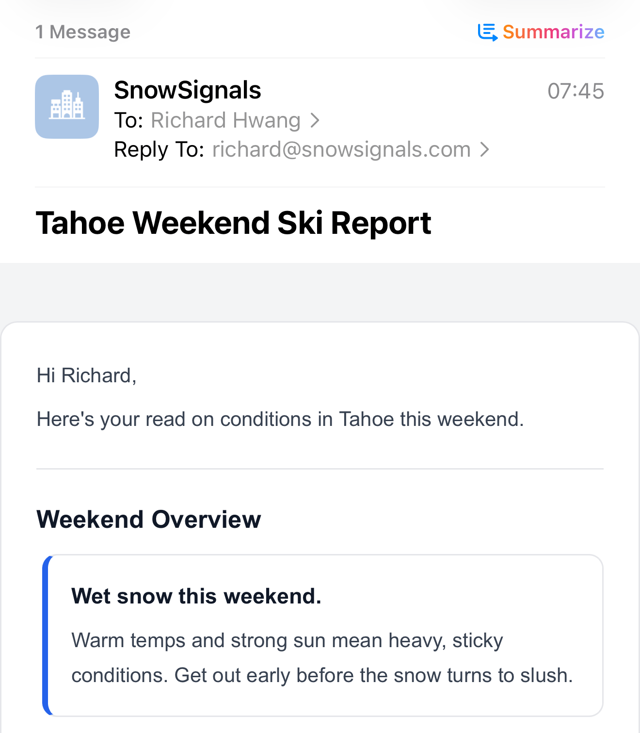 Everything you need for the weekend, straight to your inbox. The SnowSignals weekly digest gives you the low-down on conditions, the best spots to ski, and what's coming up in the forecast. Same familiar SnowSignals format - skiing-focused, with no fluff.